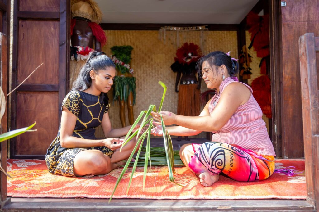 Guided tour of the village, and participation in 2 cultural workshops at choice: introduction to traditional dance, to traditional music (ukulele or to'ere), to dyeing pareo (pareo included), to hat or basket weaving (object made included), to the Polynesian cuisine (preparing raw fish, poe and ipo). Lunch at Tiki Village