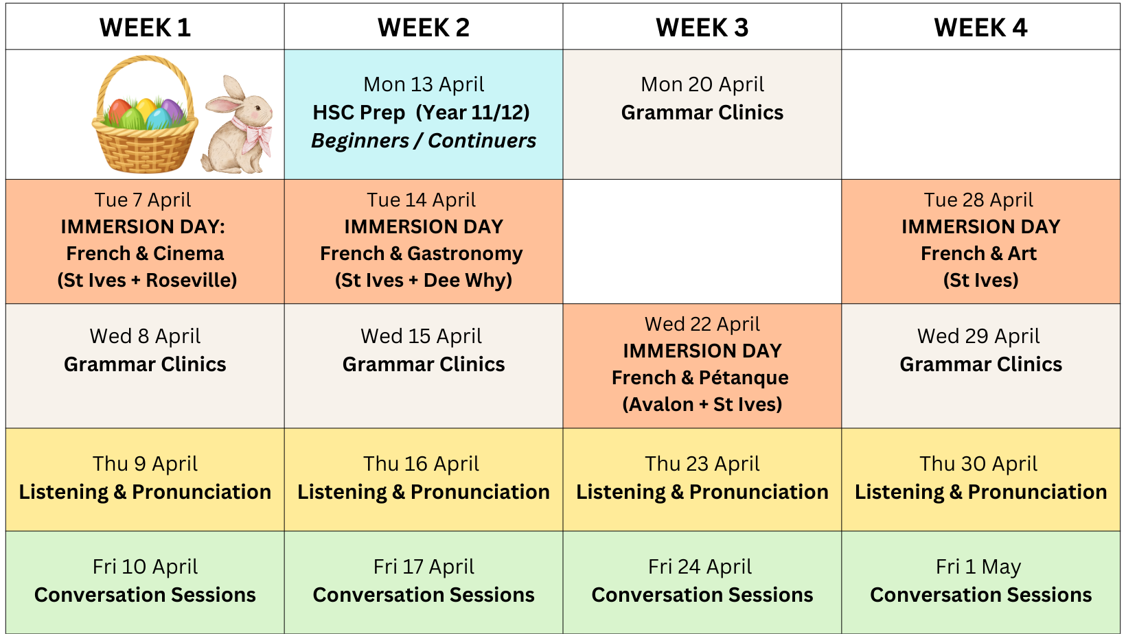 This delicious immersion day celebrates French gastronomy in all its forms. Through an interactive workshop, we’ll explore French food culture, regional specialities and the language of taste, before heading out for a hands-on chocolate workshop with Hélène from Choc & Moi in Dee Why.